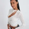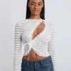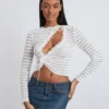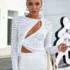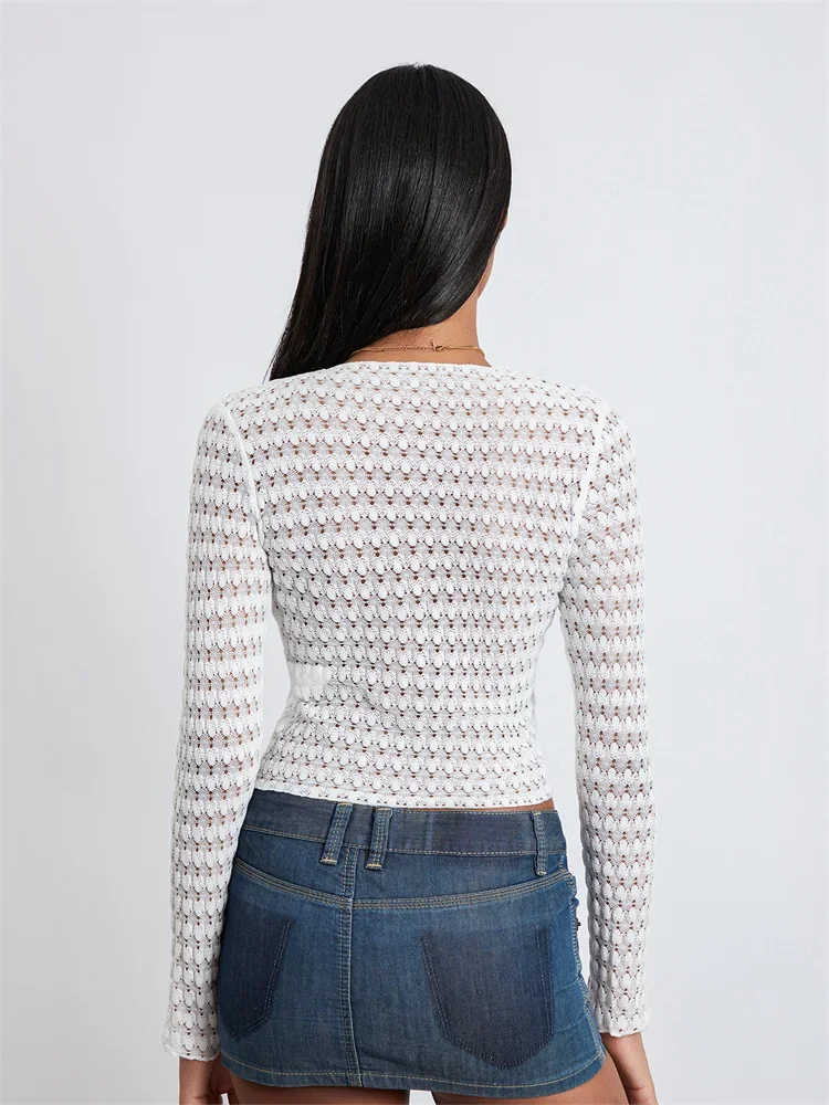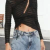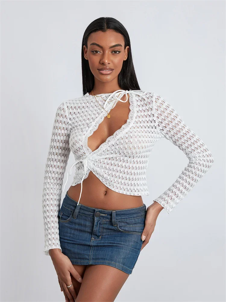 Women T-shirt, Long Sleeve Crew Neck Tie-up Hollowed Irregular Ladies Crop Top Clubwear