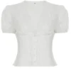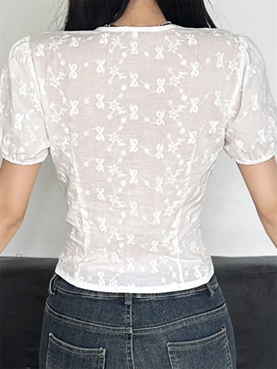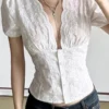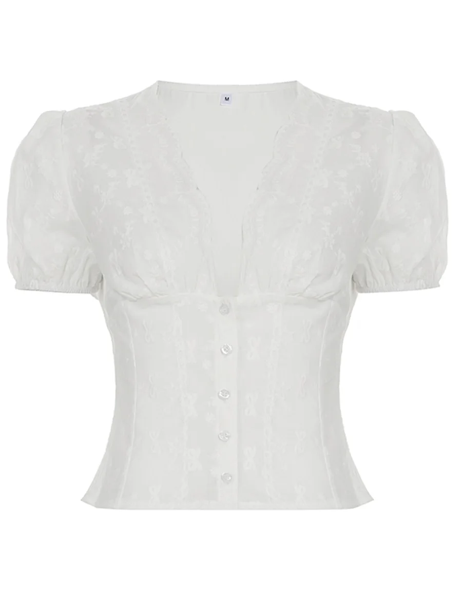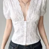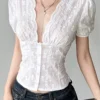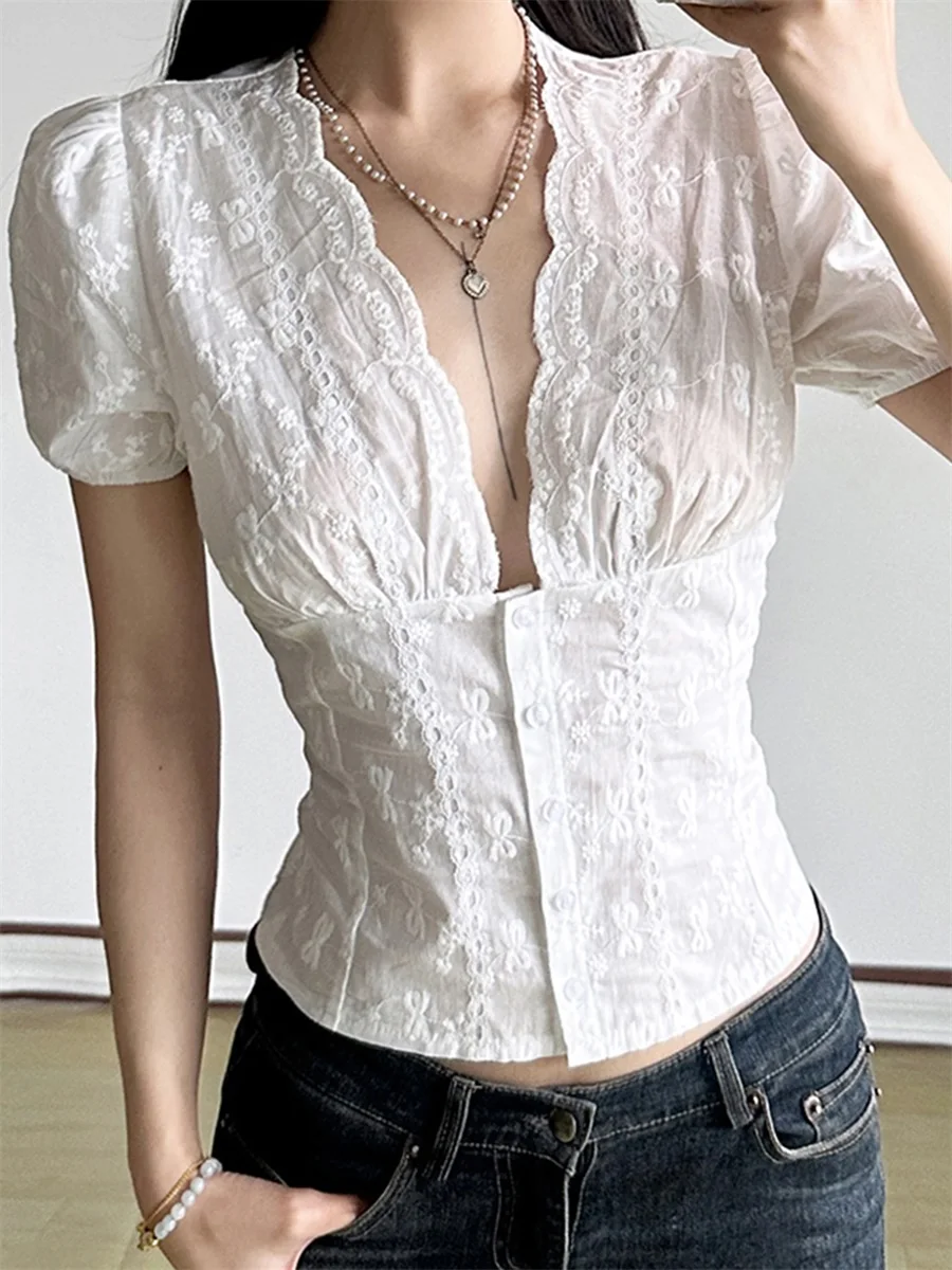 Women’s Summer Tops Lace Embroidery Slim Fit Cropped T-Shirts Short Puff Sleeve Deep V-Neck Button Front Shirts